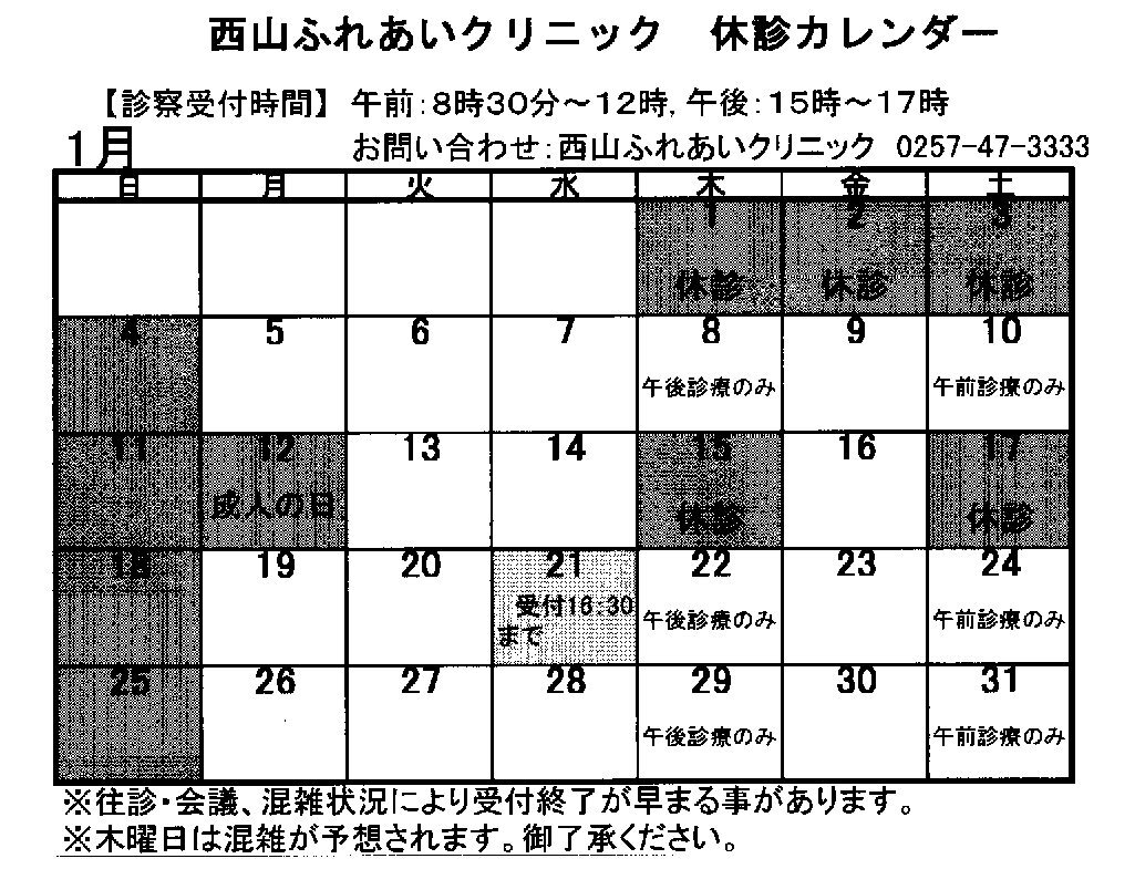 ●1月21日(水)医師会行事により、受付16:30までとなります。